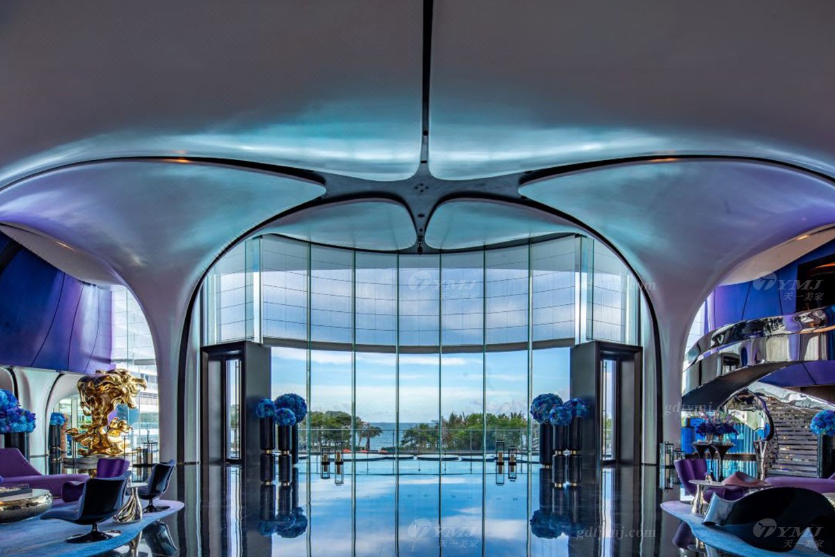 大堂及大堂吧以“天幕·海幕·藍幕”為設計靈感,分別取意深圳這座城市:充滿生機的天之驕子,向海而生、因海而興的海洋文化,以及浪淘梅沙、海天一色的絕佳山海景觀,天花及墻體采用白色幻彩瓷化膜,獨特的設計風格,當陽光照射時,便會呈現出魔幻流動的光影效果,營造出時尚動感的氛圍。