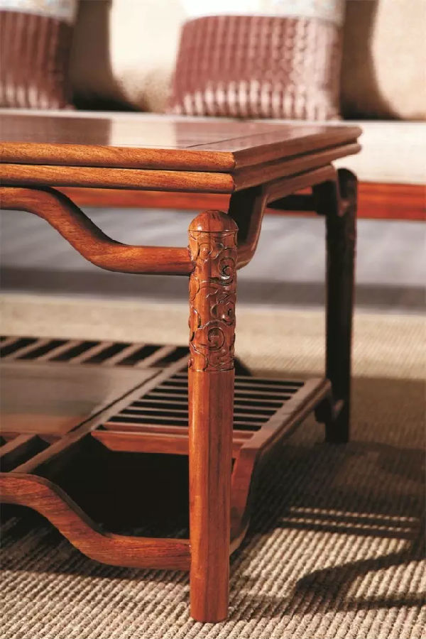 花梨概念細(xì)節(jié)處理:紅木客廳沙發(fā)雕花處采用花磨工藝,板件采用刮磨工藝,保證了油漆處理:漆膜打磨到位,光滑細(xì)膩,無論是外還是內(nèi)做到表里如一。