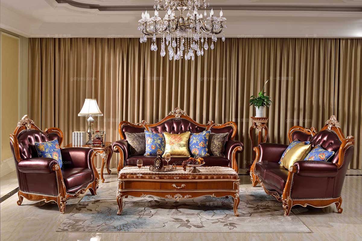 名貴法式實木家具品牌雕花暗紅真皮客廳沙發