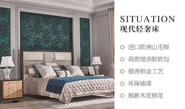 高端現代輕奢床實木臥室大床楓影木皮拼花真皮床臥室系列