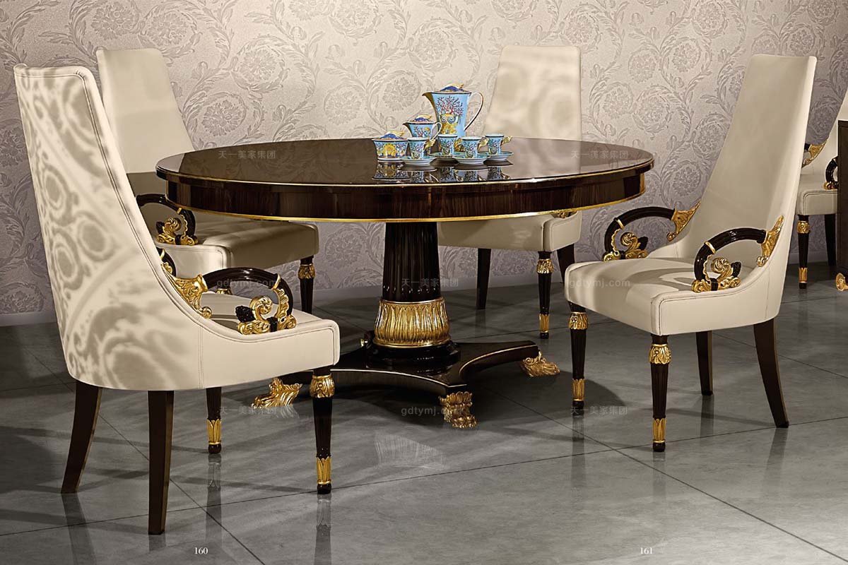 高端別墅歐式黑檀餐桌+手工鏤空雕刻貼金箔餐椅組合