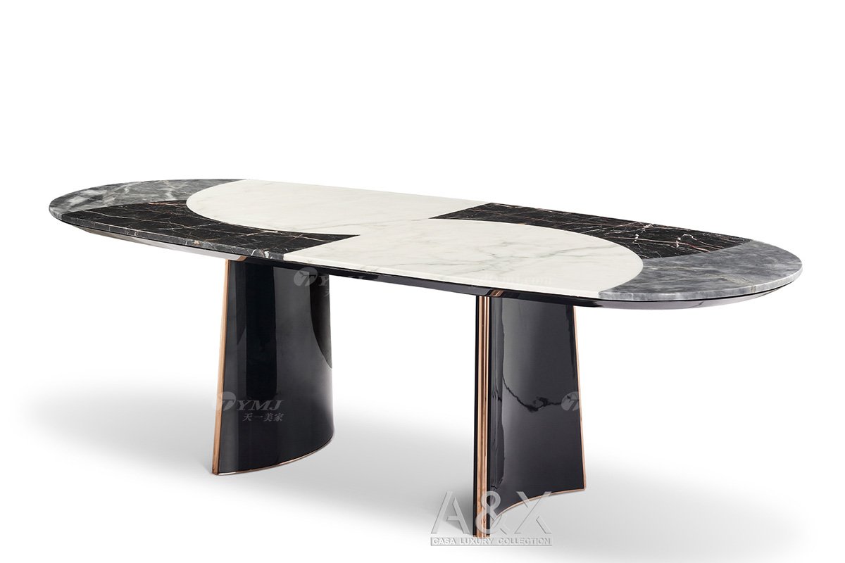 高端別墅豪宅家具品牌高端樣板間家具輕奢后現代時尚魚肚白黑白線石材拼面餐桌