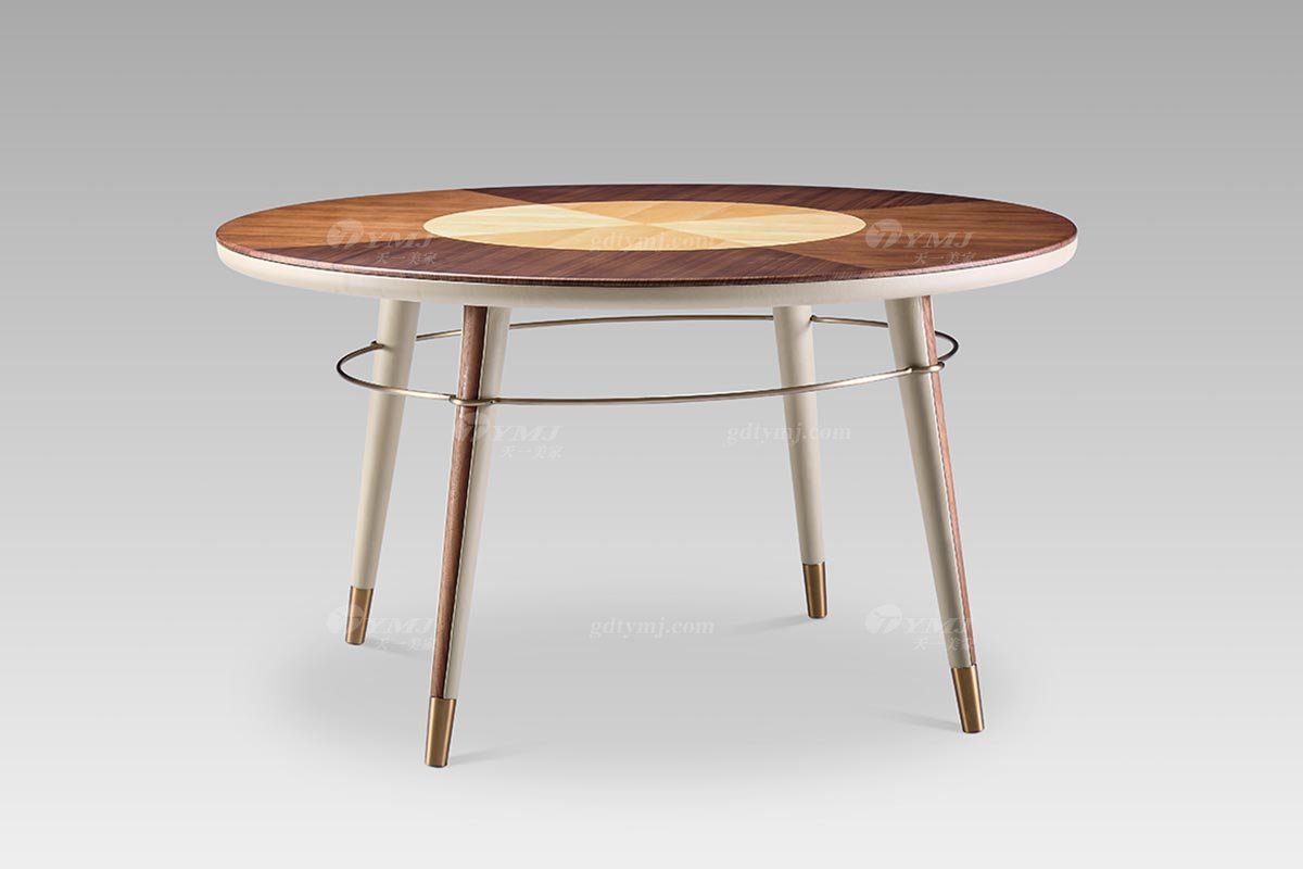 現代輕奢別墅會所家具時尚胡桃色+尼斯色真皮圓餐桌