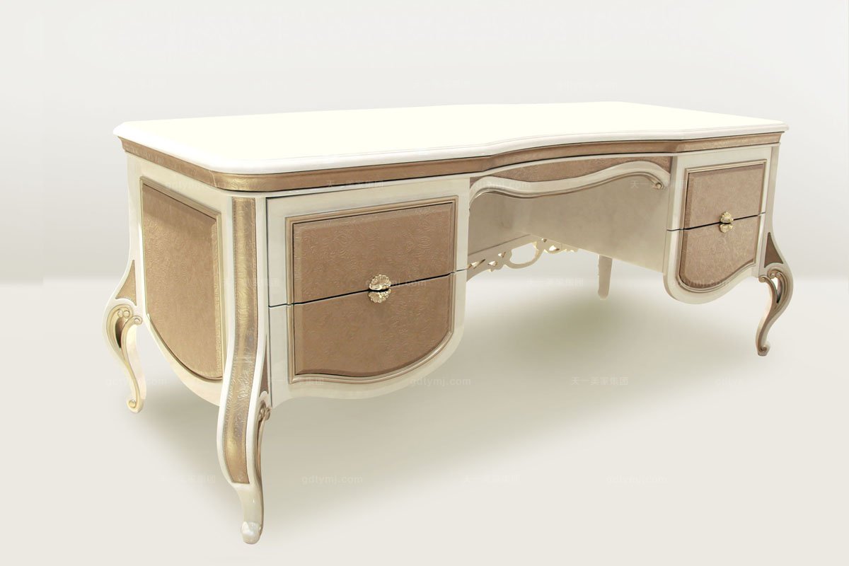 局部解說:這款書桌采用大面積的特紋皮,它是由設(shè)計(jì)師根據(jù)產(chǎn)品風(fēng)格與色彩,精心設(shè)計(jì)出花紋,開模壓花,并采用是純天然意大利進(jìn)口頭層小黃牛皮壓花,經(jīng)過18道工序處理后才形成這種效果,花面凹凸有致,邊緣并經(jīng)過明線車縫,邊緣平滑無毛邊。奶白色高亮光雙色鋼琴漆配上鍍金鏤空雕花,讓您的家看上去華麗貴氣,簡潔凝練。精心設(shè)計(jì)的貝殼狀拉手,精致時尚。德國柏隆滑軌,抽屜滑軌拉出時阻力小,平穩(wěn),沒有異響,靜音,回彈力和順滑度好,抽屜推回去時有緩沖自動回收的功能,充分保障了人的安全與家具的安全。抽屜采用實(shí)木增加耐用度,在抽屜內(nèi)底更是采用深咖色絨布來提升品質(zhì)感,完美體現(xiàn)細(xì)節(jié)。獨(dú)有的奶白色高亮光雙色鋼琴漆面,雙色工藝復(fù)雜,花紋立體,質(zhì)感強(qiáng),視覺效果類似石面的質(zhì)感。您看這款書桌的細(xì)節(jié)體現(xiàn)處,書桌360度美感體現(xiàn),連底部都采用波浪型曲線來體現(xiàn)線條感。書桌背面采用四抽,簡潔分明,方便物品存放及使用,更具人性化。